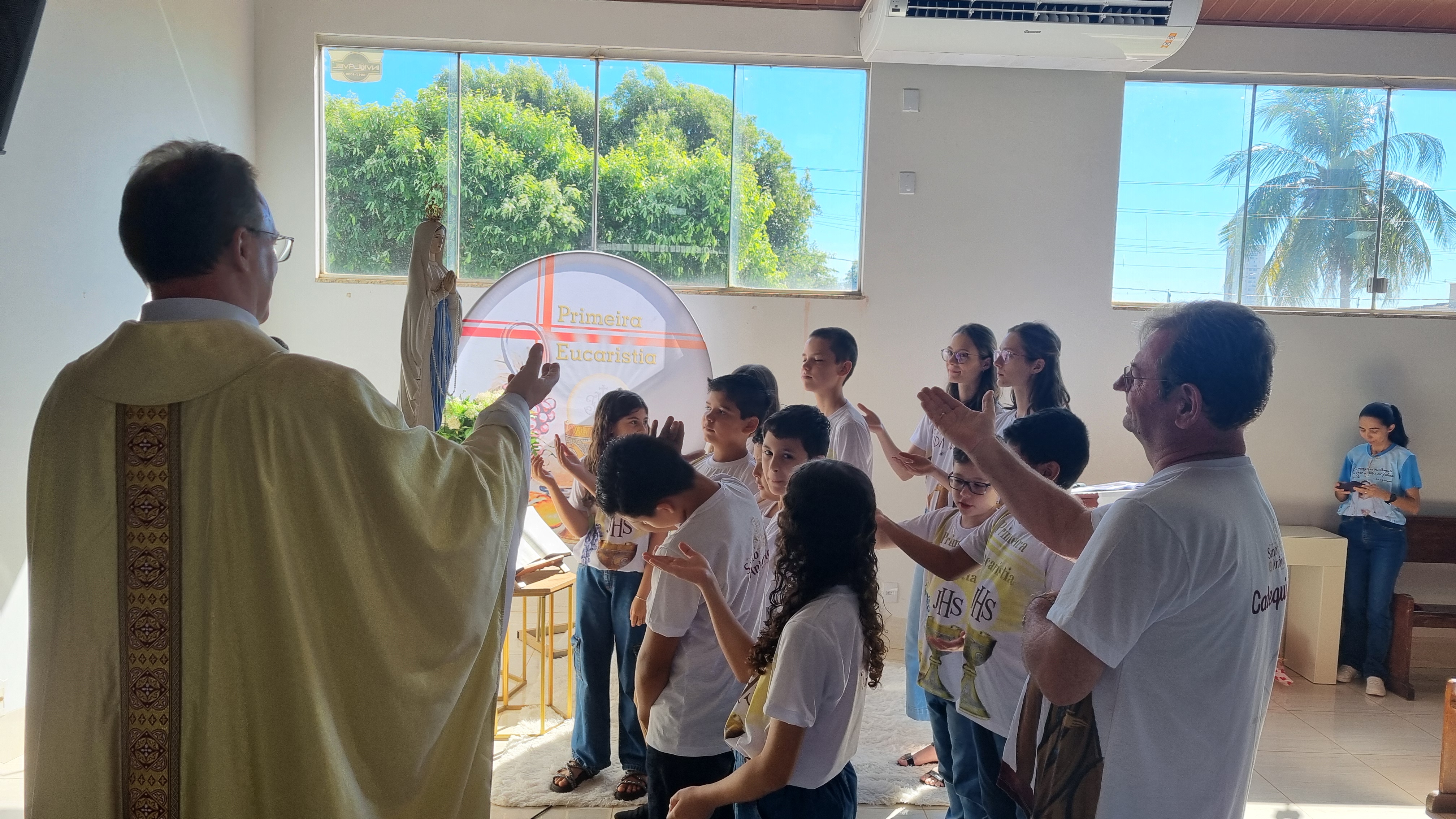 Muitas famílias da Paróquia Santo Antônio de Sinop (MT), puderam vivenciar um momento muito especial nesse último final de semana (17-18/5). 134 famílias tiveram a alegria de ver seus filhos receberem pela primeira vez a Primeira Comunhão nas missas celebradas nas respectivas comunidades: 39 crianças na comunidade de Todos os Santos (sábado, às 19h30). No Domingo (18), na missa das 8h, a comunidade Nossa Senhora de Lourdes foi agraciada com a Primeira Comunhão de 10 crianças. E para fechar com chave de ouro, às 10h, na comunidade da Matriz, 85 crianças tiveram a felicidade de receber Jesus pela primeira vez. A celebração na Matriz foi pensada para um horário especifico objetivando proporcionar espaço e conforto para todos os participantes.