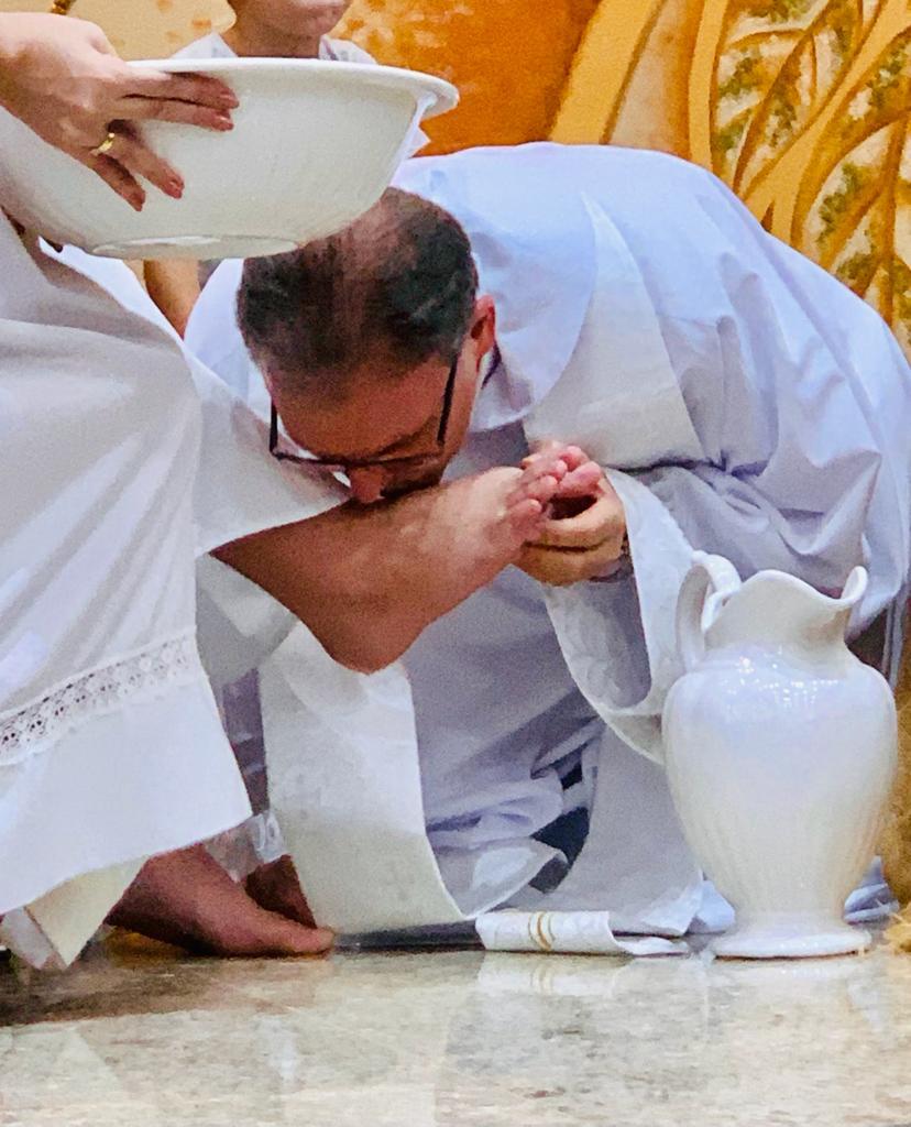 Antes da tragédia do Calvário Jesus resolveu doar-se inteiramente a cada um de nós de forma simples, pobre e escandalosa, como expressão máxima do seu amor. Com o gesto de lavar os pés dos seus companheiros, visa demonstrar a eles e a nós que no seu “reino” maior é quem se abaixa para servir, é quem lava os pés dos irmãos.