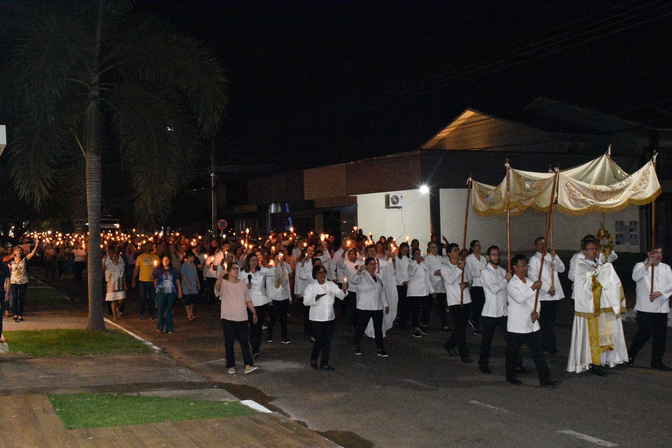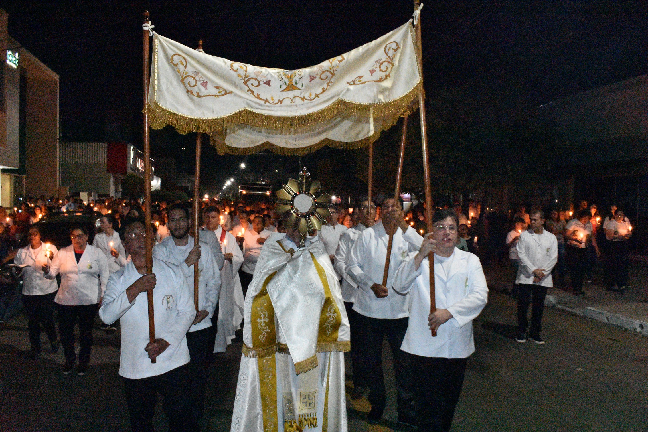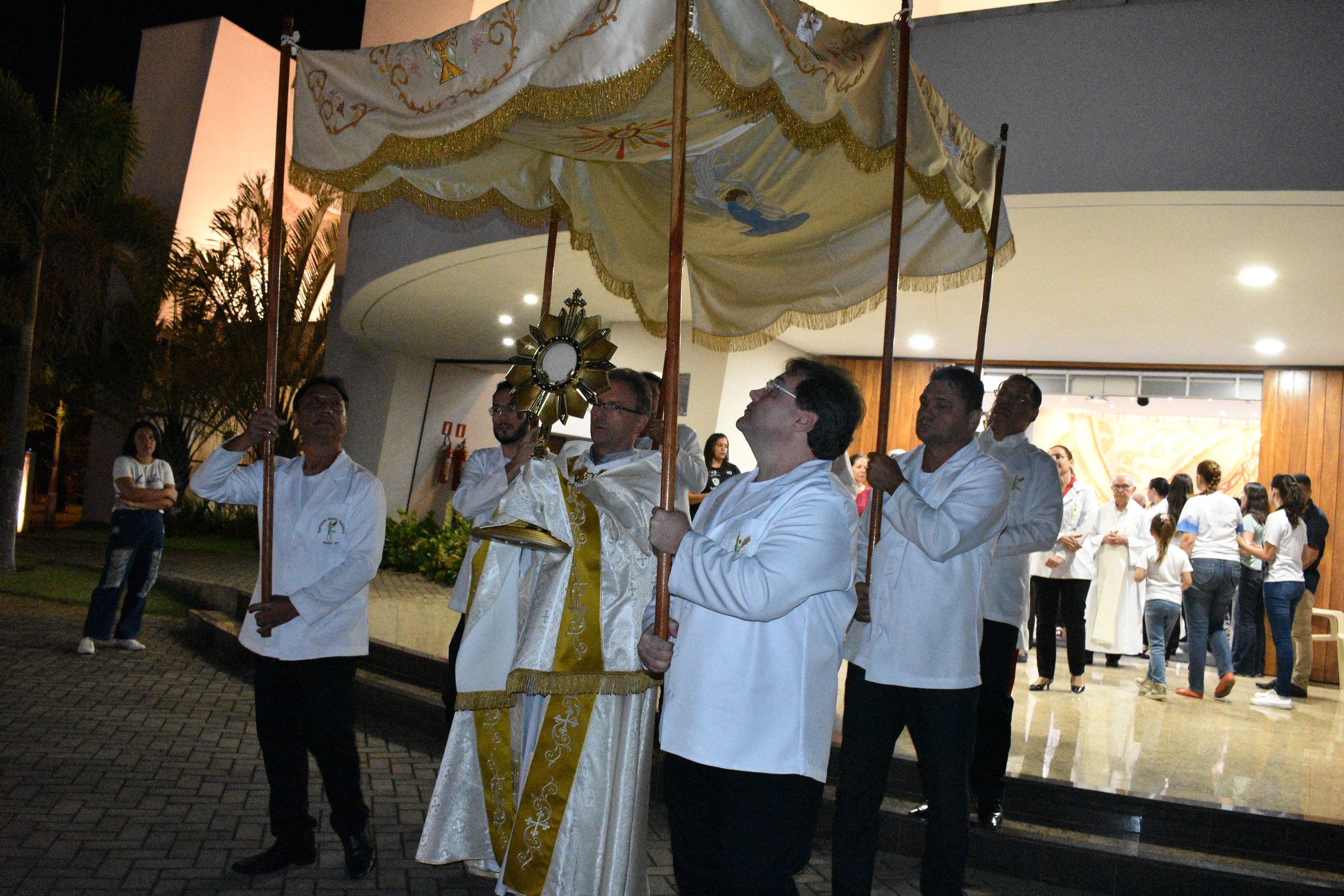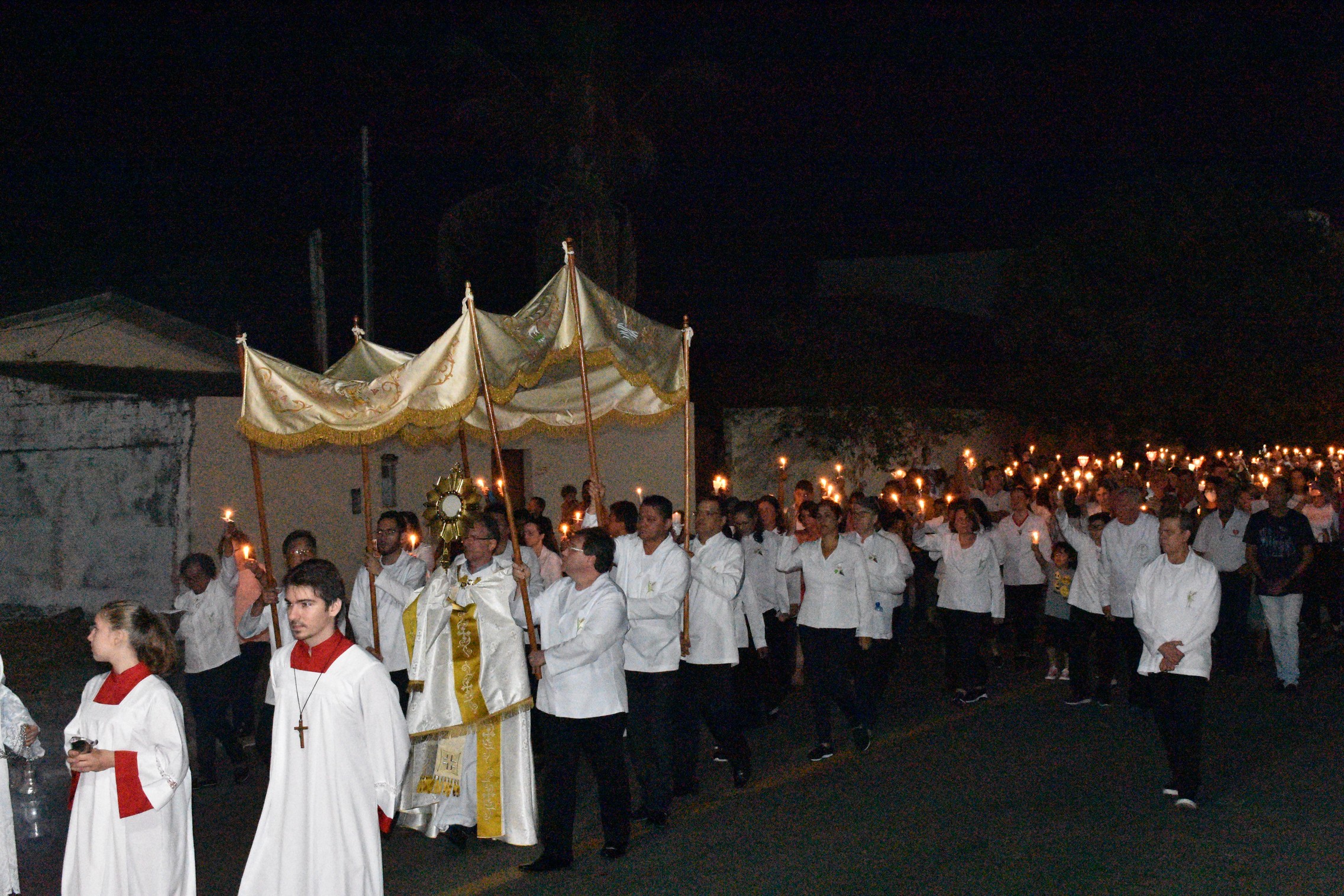 Uma multidão seguia Jesus com cantos, orações próprias e reflexões concernentes a Eucaristia. O percurso da procissão foi pontilhado por cinco paradas, com temas específicos para reflexão em cada uma delas. Um momento inesquecível para guardar no coração com sentimento de amor e gratidão. O desfecho da procissão aconteceu na Igreja de modo vibrante e feliz.