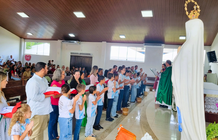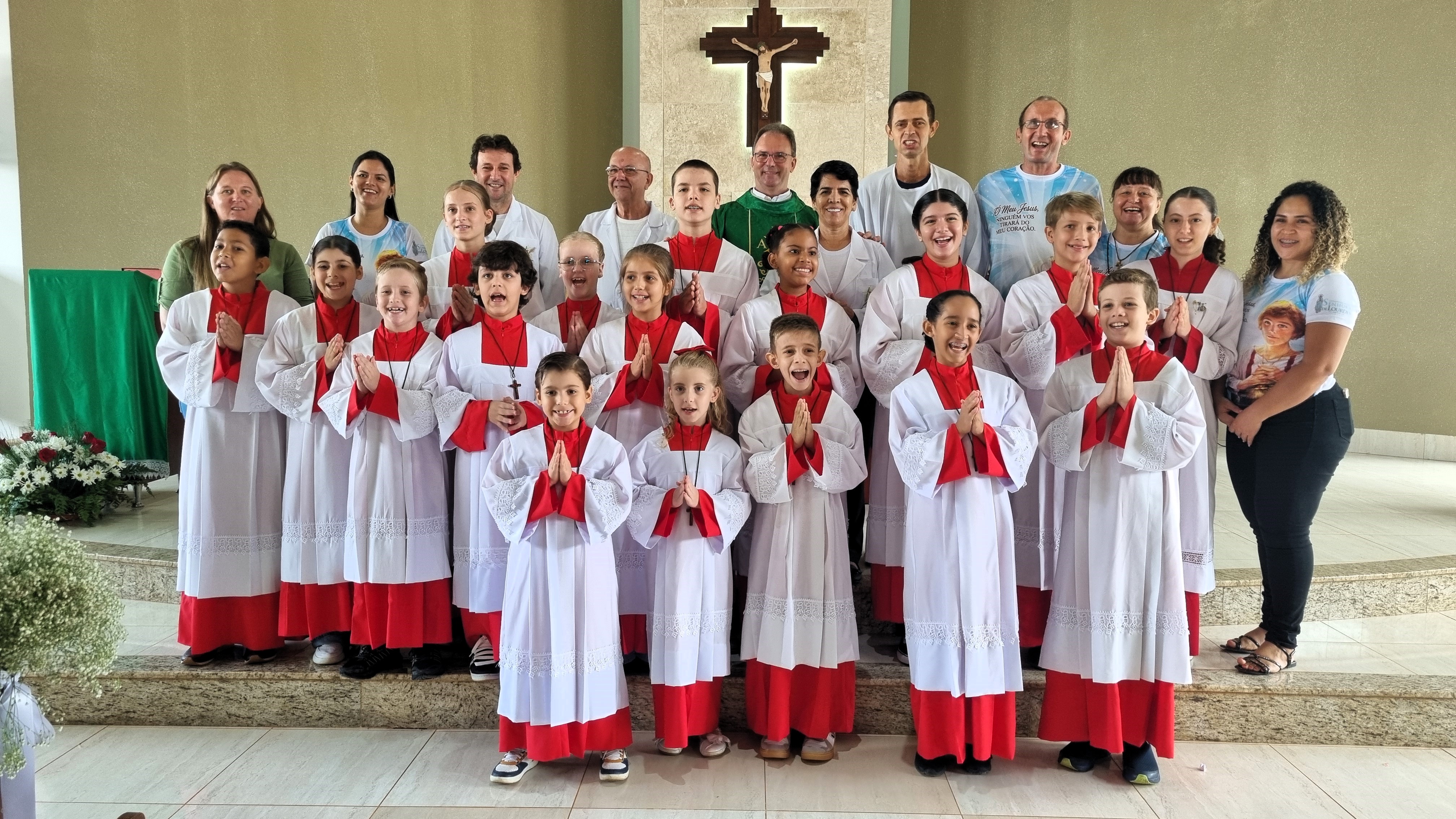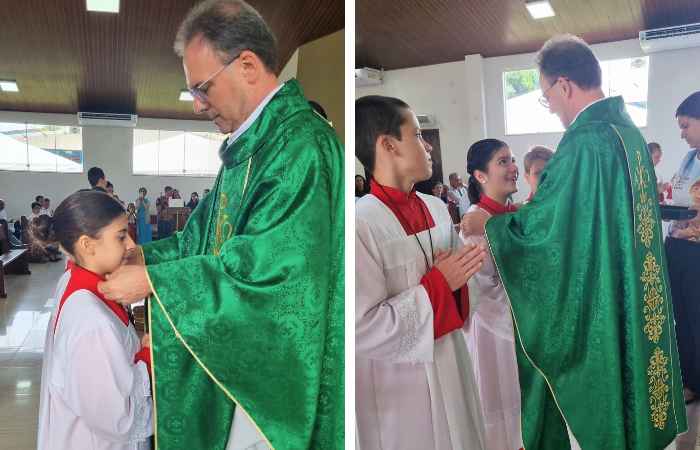 No último domingo (21), na missa das 7h30, na Comunidade Nossa Senhora de Lourdes da Paróquia Santo Antônio de Sinop, foi realizado o rito de investidura de 16 coroinhas. Percebia-se no rostinho das crianças a felicidade, emoção e nervosismo. Depois de alguns meses de preparação puderam realizar o sonho de servir o altar do Senhor.