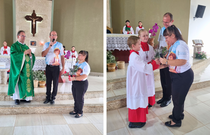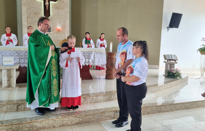 Após a homilia Pe. Roberto convidou as crianças, juntamente com os pais para se colocarem em frente ao Presbitério para a realização do rito de investidura. Antes da benção final da celebração os coroinhas fizeram uma singela homenagem de agradecimento ao casal, Aldemar e Marcia Meazza, coordenadores dos coroinhas, que com dedicação, empenho e muito carinho prepararam a meninada para esse momento especial.
