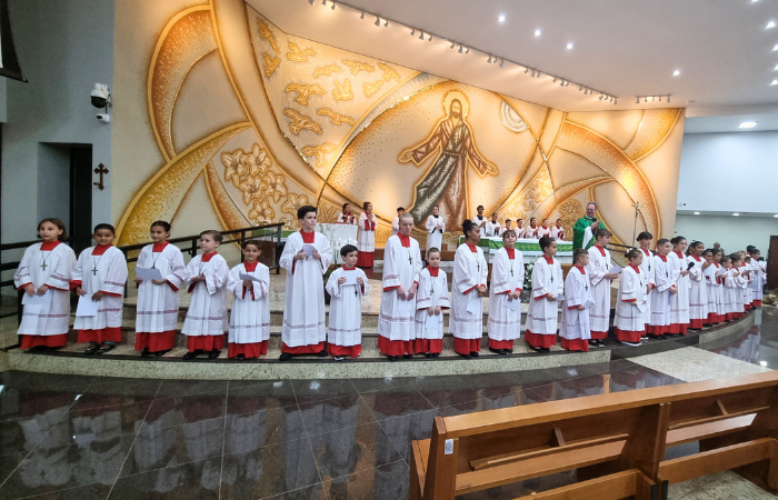 Na missa do sábado (30), na comunidade Matriz da Paróquia Santo Antônio, foi realizado o rito de investidura de 29 novos coroinhas, e a renovação do compromisso de servir ao Altar de todos coroinhas atuantes da comunidade Matriz (36) e de Todos os Santos (27).