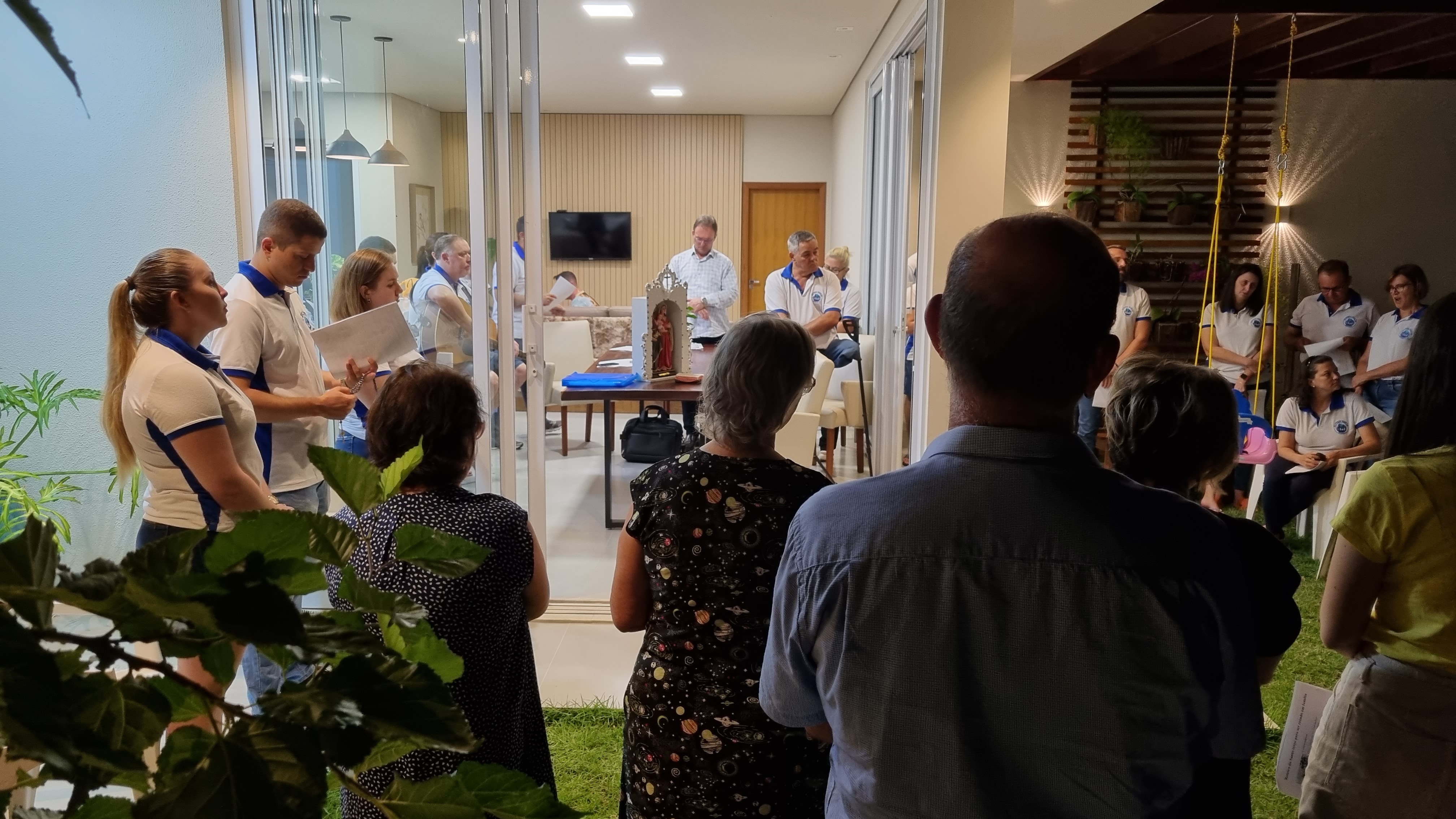 Na última reunião mensal (10/07) realizada pela Pastoral Familiar (PF) ocorreu sorteio entre os seus membros para saber quem seria a família agraciada em receber o grande grupo para rezar o Terço, e o casal sorteado da vez foi Eduardo e Nayara. Foi o que aconteceu na última sexta-feira (28). Estiveram presentes para esse momento os familiares do casal: os pais, irmã e cunhado da Nayara, e a mãe e a avó do Eduardo, bem como as filhas Manuela e Clara.