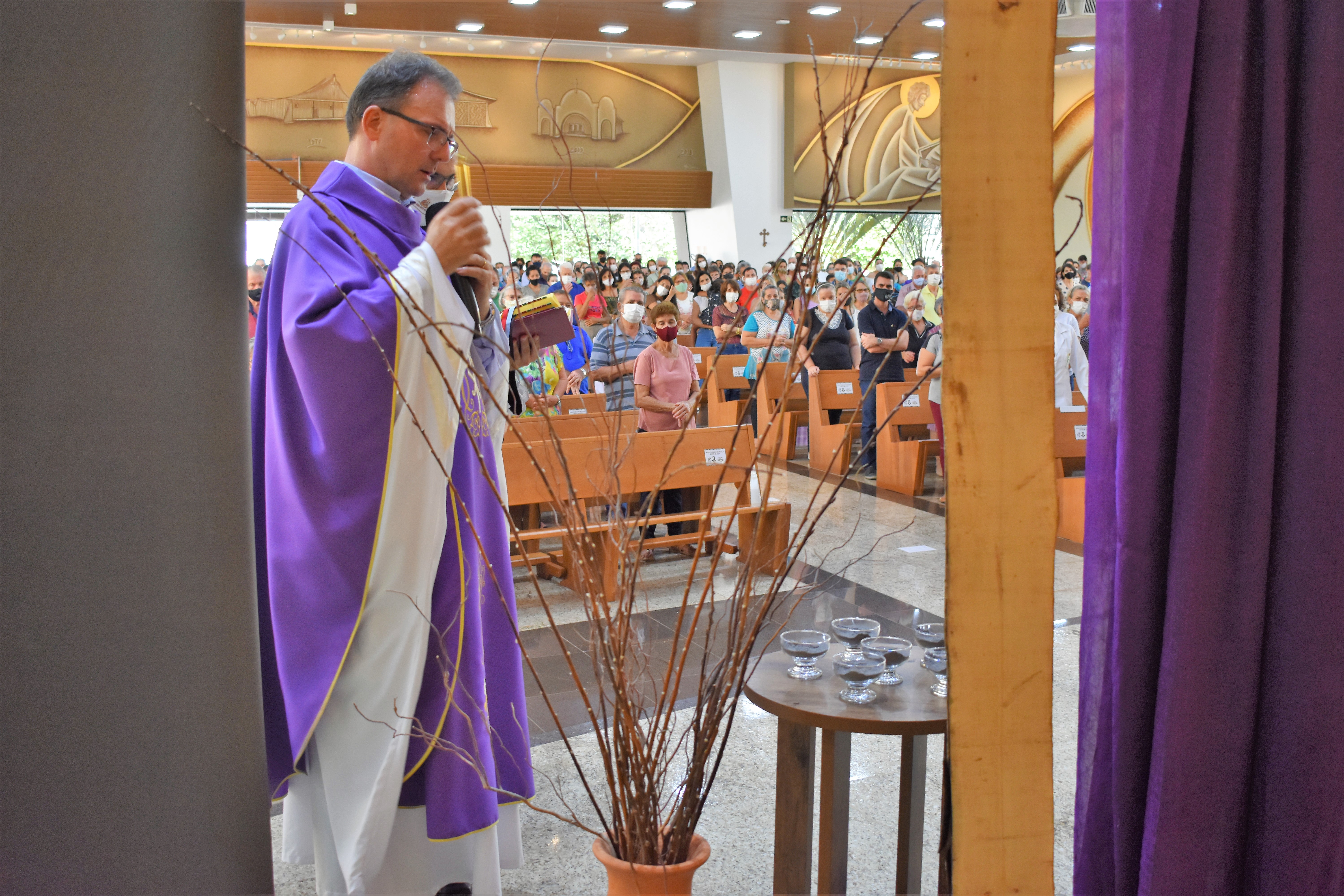 Aumentar Fonte +Diminuir Fonte -Começou o tempo litúrgico da Quaresma! Trata-se de um tempo em que os católicos são convidados a meditar, jejuar, orar e vivenciar mais intensamente o Evangelho, em preparação para a celebração da Páscoa. A quarta-feira de Cinzas marcou o início deste grande retiro da Igreja e também o início da Campanha da Fraternidade 2022 com o tema: “Fraternidade e Educação” e o lema “Fala com sabedoria, ensina com amor” (cf. Pr 31,26).Na igreja Matriz de Santo Antônio a Quarta de Cinzas (02/03) foi mais do que especial. O dia começou cedo, as 6h30min, o Pároco, Padre Roberto Gottardo,SJ, deu início a vigília e adoração do Santíssimo Sacramento, em resposta a convocação do Papa Francisco, de que os católicos permanecessem em jejum e oração pelas vítimas da guerra e pela paz mundial.A vigília se estendeu até às 14h30 quando foi realizada a primeira Missa da Quarta-feira de Cinzas da Paróquia. “A Conversão é um verdadeiro milagre porque é muito difícil mudar, mudar de vida, de forma de pensar e forma de agir. Como disse Albert Einstein ‘É mais fácil desintegrar um átomo do que um preconceito’, principalmente quando se leva em conta a sociedade que nos rodeia. Mas essa é a hora, a hora de tomar atitude de mudar, de atirar ao fogo as máscaras, não apenas as do carnaval, mas as que usamos todos os dias, e focar no que realmente é essencial, lembrando sempre dos três pilares da piedade religiosa: a esmola, a oração e o jejum. Práticas religiosas que devem ser praticados com sinceridade de coração, sem hipocrisia”, disse o Padre Gottardo, citando São Gregório Magno: “É tempo de limpar e enfeitar a casa por dentro, o nosso coração, para vivermos de modo sábio e santo, agradando a Deus e encontrando o divino em nós”. Durante a Missa o Padre Roberto também destacou o início da Campanha da Fraternidade 2022 e o objetivo da CNBB ao dar prioridade a educação. “A educação é o pilar de nossa sociedade e a pandemia escancarou as deficiências de nosso país nesse setor, por isso é tão oportuno colocar luz sobre a educação, que também é o pilar da paz, ou seja um setor que precisa de atenção e de investimentos, além claro do envolvimento de todos”, pontuou.Este dia santo e especial foi encerrado as 19h30min com missas simultâneas nas três igrejas da Paróquia: Santo Antônio, Todos os Santos e Nossa Senhora de Lourdes. Nas três celebrações repetiu-se as leituras, salmo e Evangelho da Liturgia própria do dia, além de ser realizada a cerimônia de imposição das cinzas, com excelente participação de fiéis. A imposição de cinzas simboliza a vontade de cada fiel de manter-se no caminho correto do cristianismo, da sua disposição em converter-se e de reconhecimento da sua mortalidade que necessita da graça divina para “combater o bom combate da fé”. A imposição de cinzas surgiu na Igreja Primitiva e foi incorporada como um ritual sacramental da Igreja Católica por volta do século XI. As cinzas utilizadas no rito simbólico da “imposição” sobre a cabeça dos fiéis são originárias dos ramos que foram abençoados, usados e guardados no Domingo de Ramos do ano anterior.