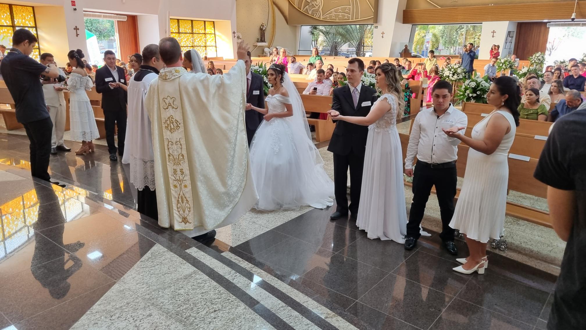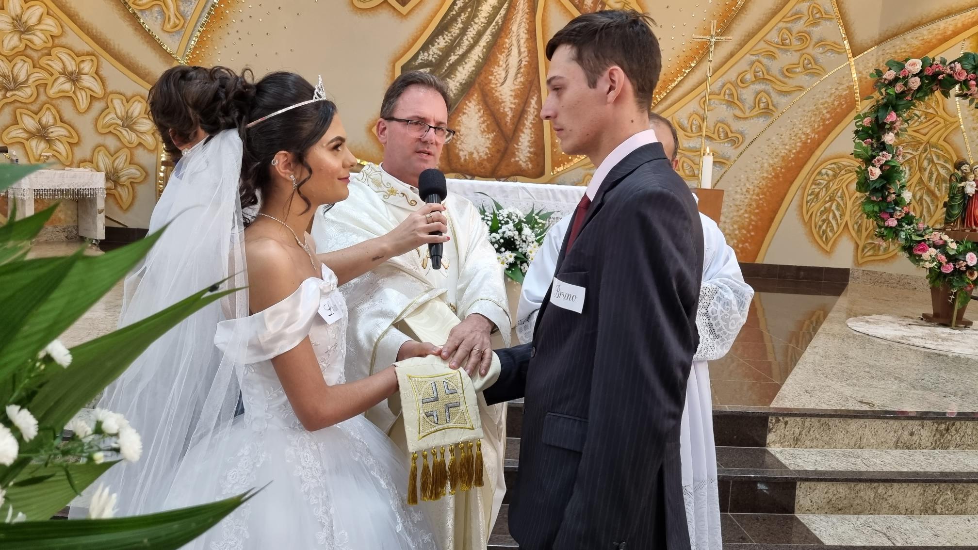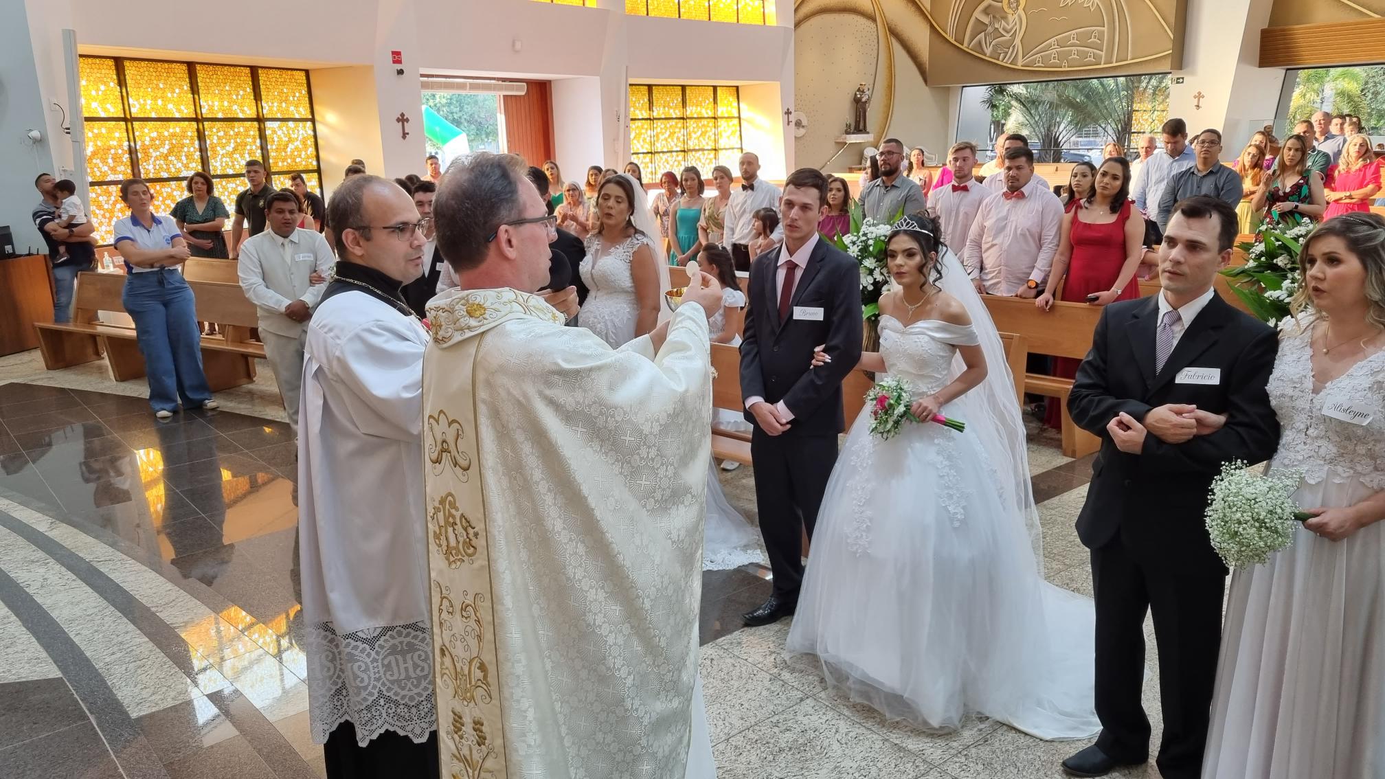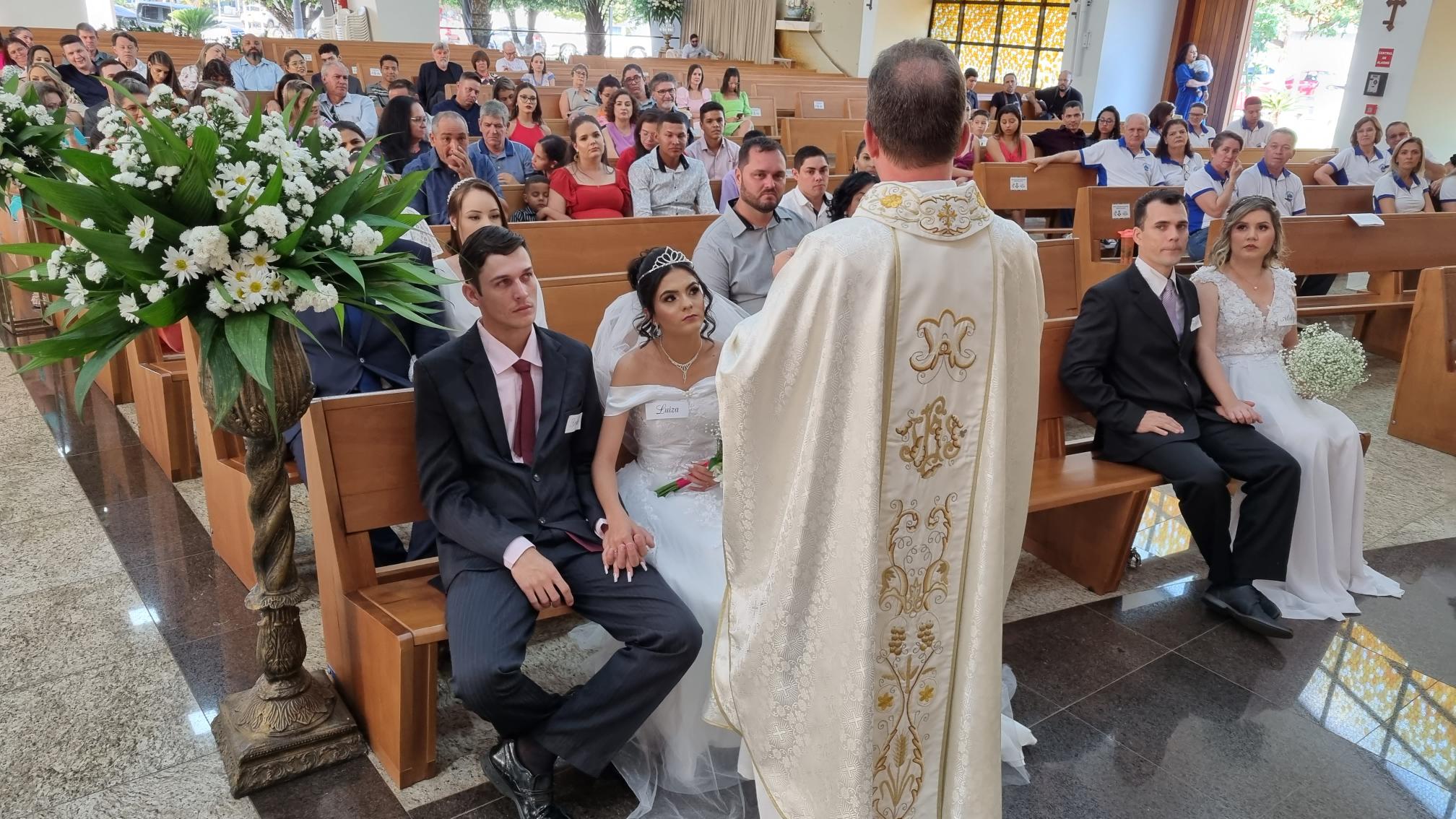 O casamento foi celebrado pelo pároco, Pe Roberto Gottardo, que lembrou que o sacramento do matrimônio é o caminho natural de vocação matrimonial na vida de um homem e uma mulher que se declaram cristãos católicos. Ele lembrou que “o casamento não deve ser algo impositivo, de carácter obrigatório, mas é uma questão vocacional”. “O casamento vem se constituir num momento culminante na vida de um casal e deve ser compreendido como uma resposta ao amor, porque Deus nos fez para amar e para sermos amados”, pontuou referindo-se à vocação da vida matrimonial. “Hoje em dia, infelizmente, impera a mentalidade onde tudo parece ser descartável e a dinâmica provisório impõe-se sempre mais como “estilo de vida”, tudo se apresenta efêmero, mas a palavra de Deus continua sendo perene”, finalizou referindo-se à consciência da decisão de um casal em celebrar o sacramento do matrimônio que deve ser duradouro, pois se trata de realizar “a vontade de Deus”.