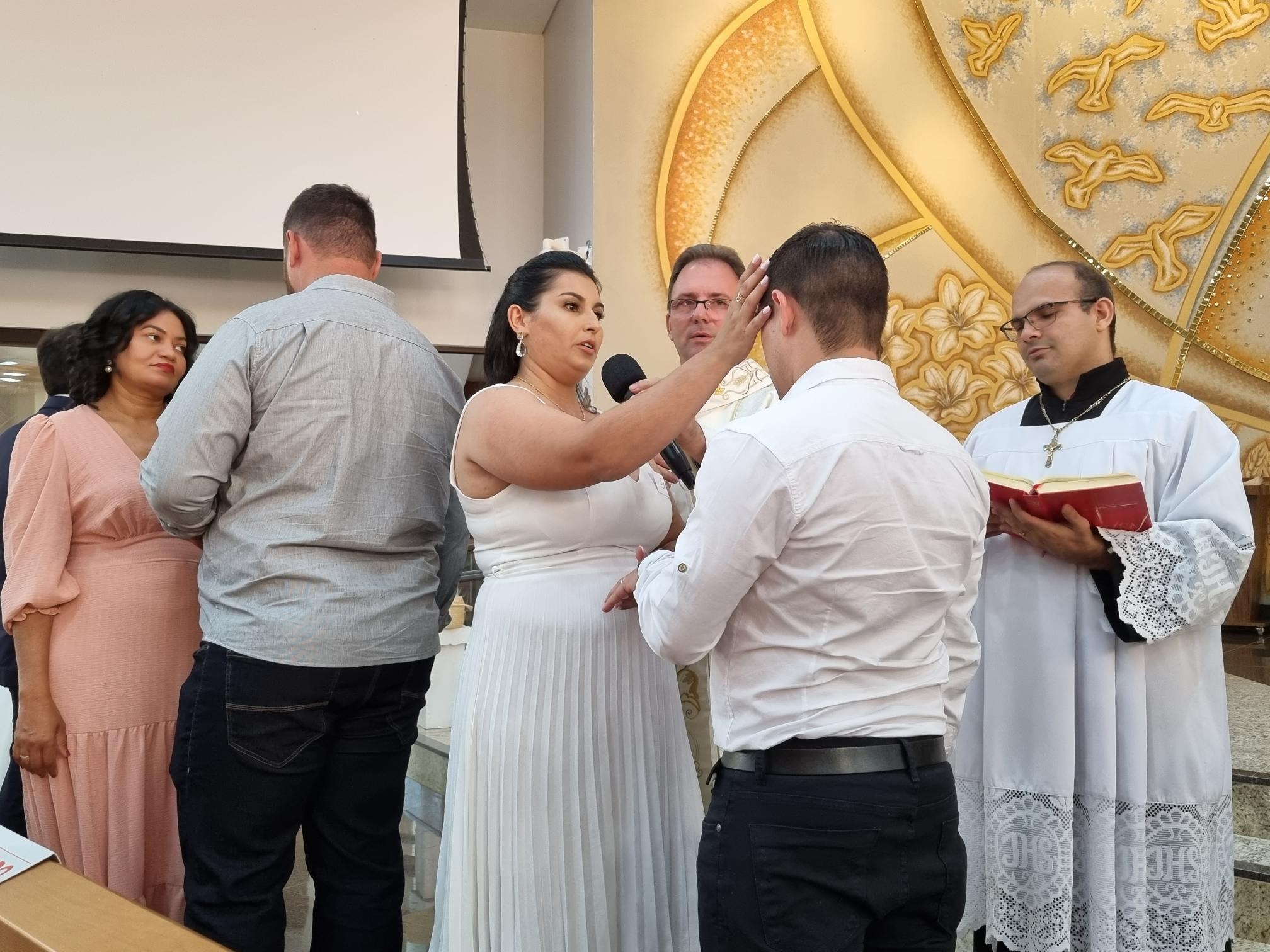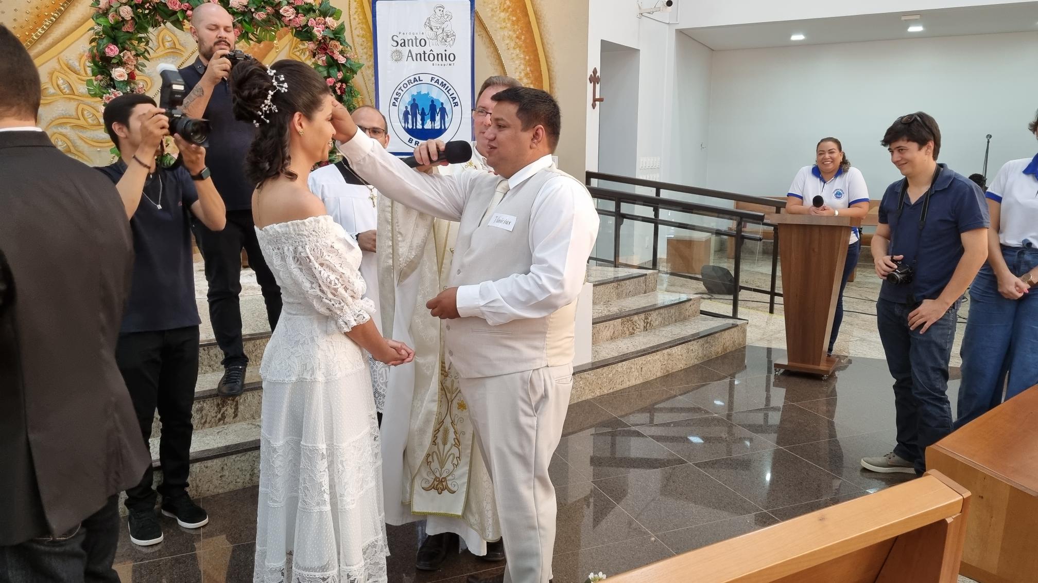 Ademis da Silva Fernandes e Gleiciele Santos de Oliveira, estão unidos desde o nascimento da filha de 10 anos e agora decidiram sacramentar a união para viver uma vida cristã correta. “A nossa filha agora vai para catequese, vai começar a seguir a vida da igreja, e a gente estava errado, então resolvemos acertar as coisas, pois a benção de Deus é muito importante”, pontuou Gleiciele. “Depois de 10 anos a gente vai casar, vai regularizar a situação e isso é muito bom”, comemorou Ademis.