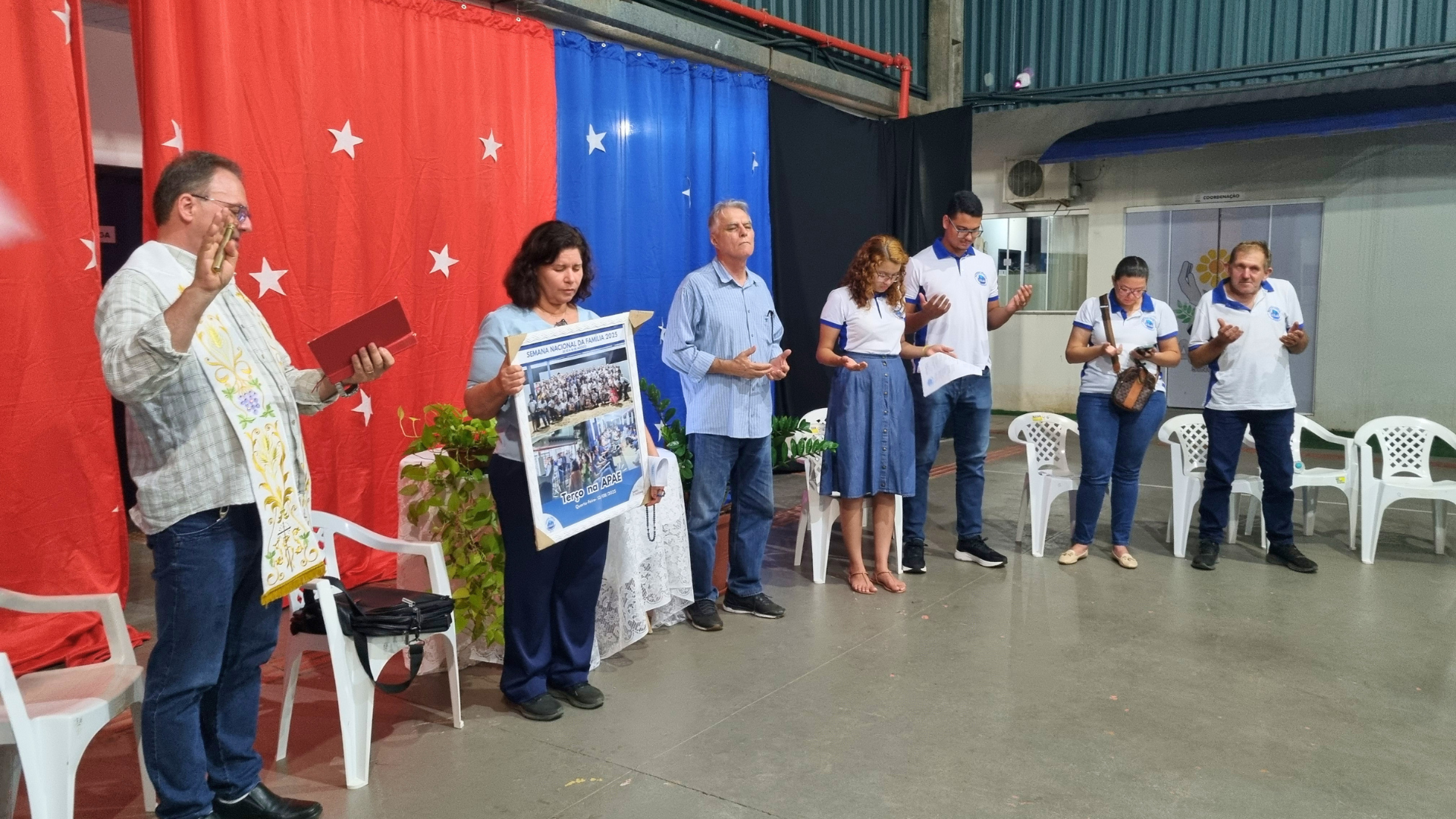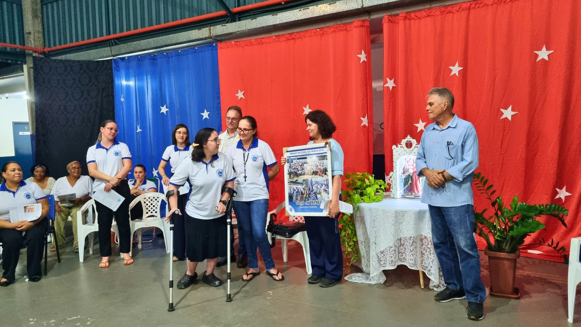 Ao final do terço, o padre Roberto convidou a senhora Regina para dizer algo sobre a missão da APAE. Em sua fala, ela expressou profunda gratidão pela presença da Pastoral Familiar, recordando que, no ano passado, receberam a Pastoral e, neste ano, teve a satisfação de convidá-los novamente para estarem presentes, convite que foi prontamente e generosamente aceito. Destacou que a instituição atua há 42 anos na cidade de SINOP, atendendo atualmente cerca de 280 assistidos, desde a infância até a fase adulta. Ressaltou ainda o valor da participação das famílias, essencial para o desenvolvimento, segurança e fortalecimento do trabalho realizado.
